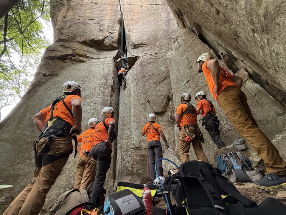 The operation helped us practice for patient evacuations in perilous vertical environments and helped to ensure that we will conduct complex maneuvers under stress with precision and reliability. Thanks to all the rescuers who practiced from 9 a.m. until mid-afternoon and to the visitors, including a wedding party that came down the trail. All of them patiently worked with us, waiting while evolutions were in progress