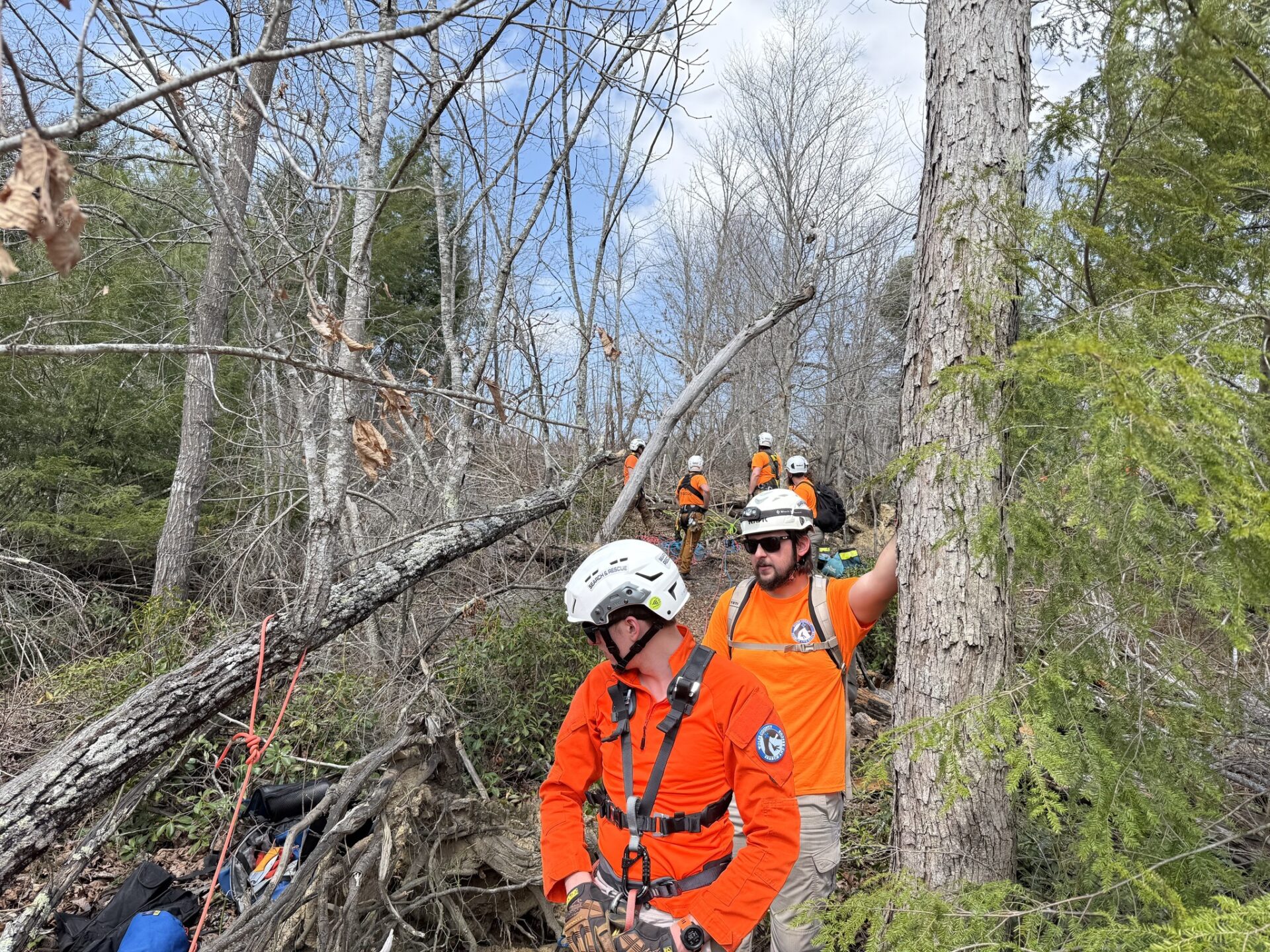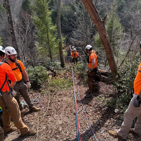 In late afternoon March 30, WCSART received a 911 call from Menifee County dispatch for an injured hiker at Broke Leg Falls. The female subject was hiking downstream in a very rugged and cliffy area when she sustained a significant lower leg injury. Menifee County Fire and EMS were already on scene upon the team’s arrival and advised that a typical carryout would not be possible due to her location and rough terrain.
