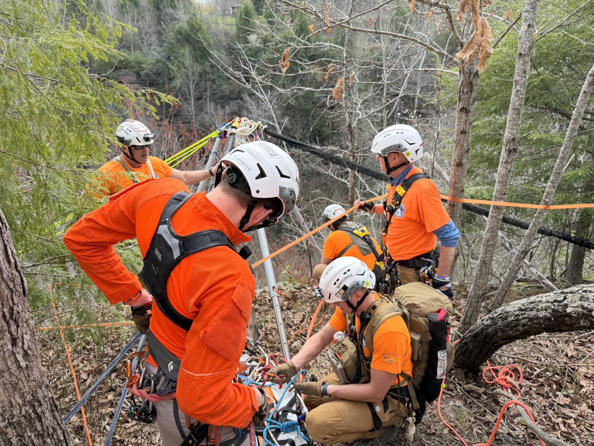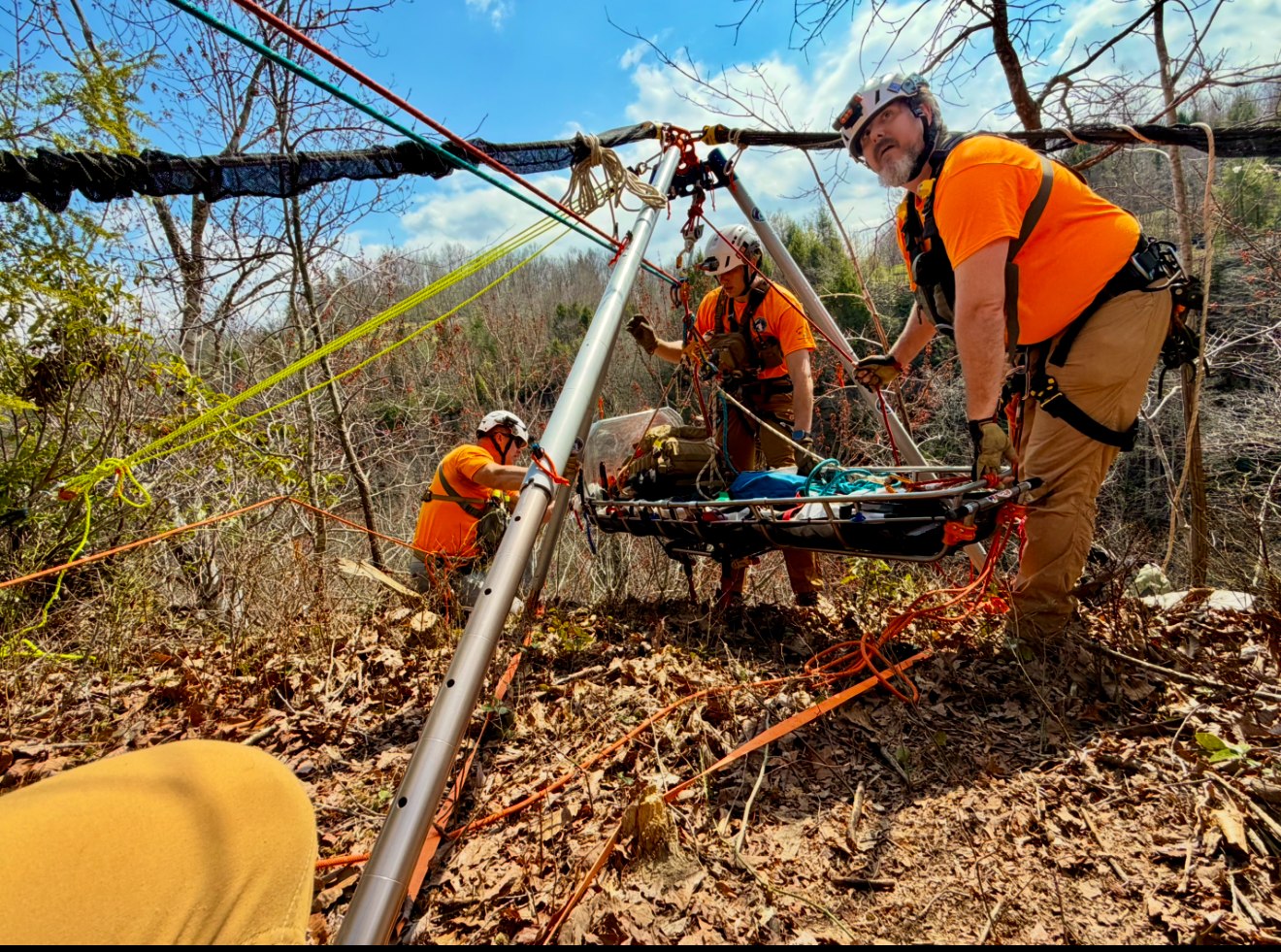 Team members then accessed a cliff line near and above her location. As a result of the tornado that hit this area several years ago, the team faced a lot of blowdown, and proper anchors dictated the raise operation. In addition, a high directional anchor was also not present, so we utilized the Arizona Vortex as an artificial high directional (AHD) on the cliffs edge. This was the first time we’ve had to use this tool as typically we have trees for a high directional along cliff lines, but that wasn’t the case today.