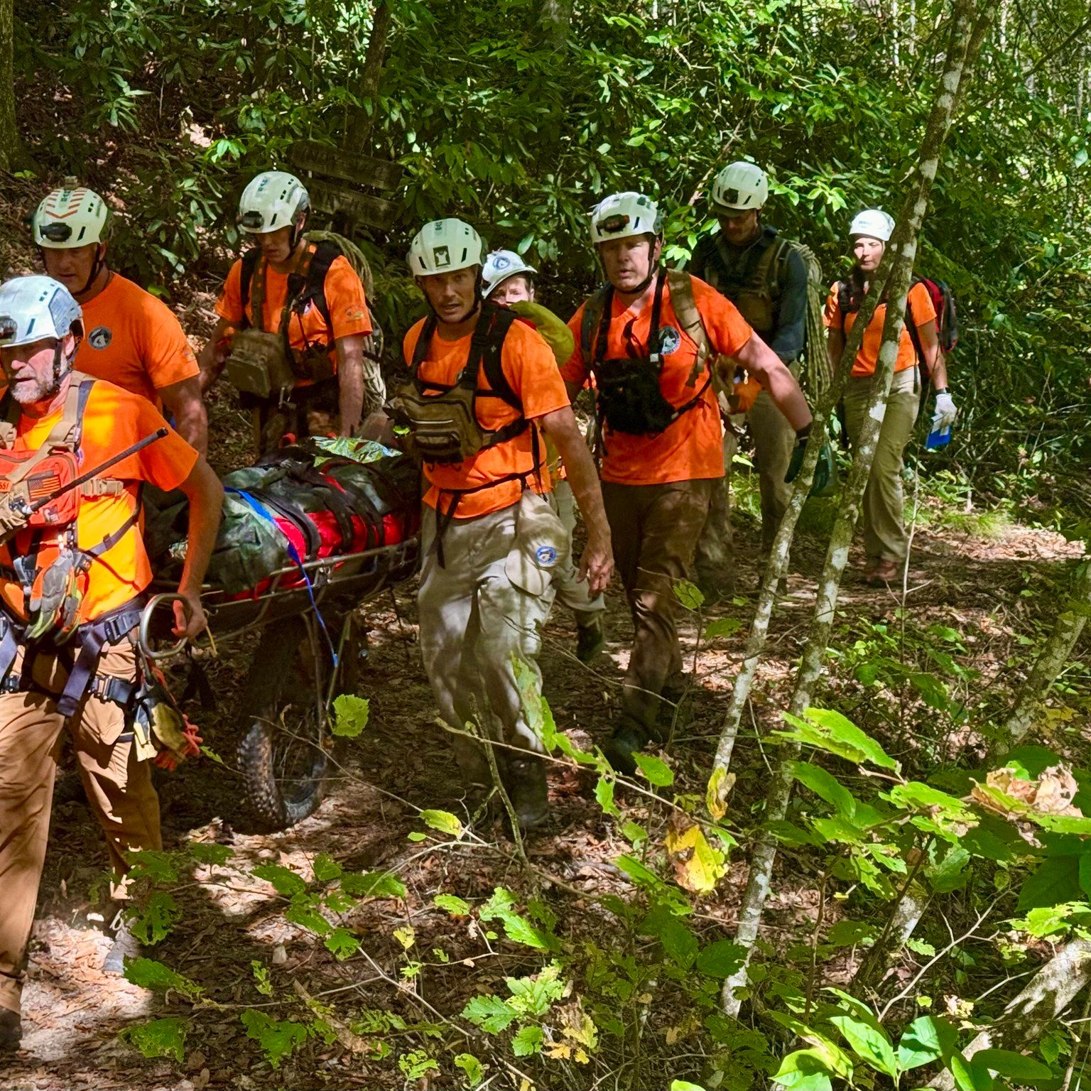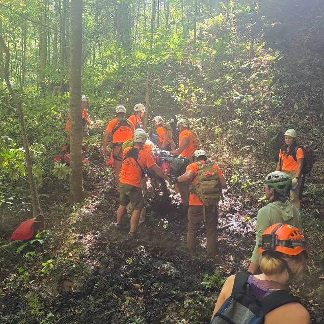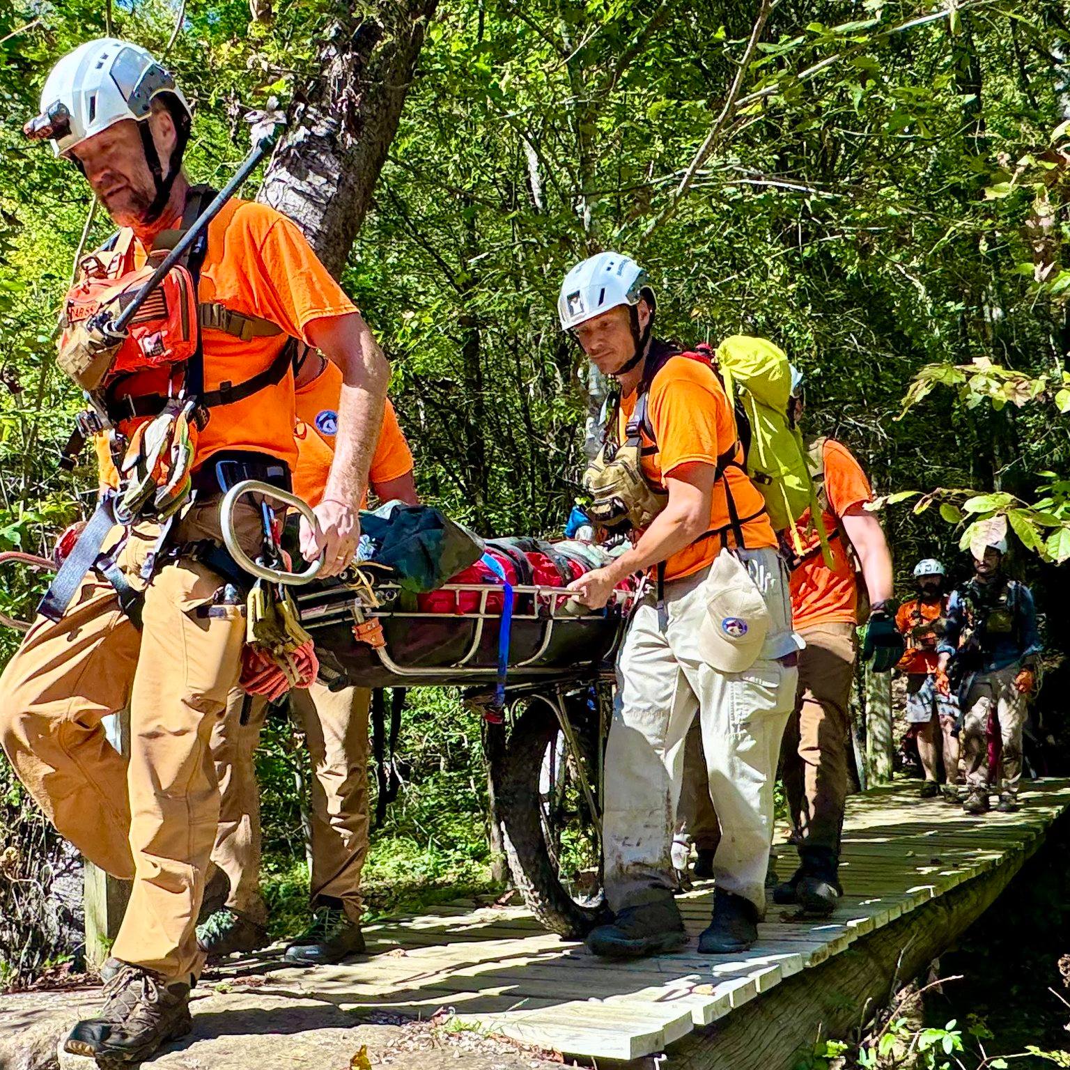 As team members accessed the climber’s location near a climbing crag known as Inner Sanctum, it became immediately apparent he was in serious condition. The team requested a medical helicopter from Air Evac Lifeteam 118 West Liberty, KY and an EMS transport from Cross Medical Response to be staged at the Muir Valley floor. Upon arrival, a paramedic, two nurses and an EMT immediately began rendering care. They treated multiple traumatic injuries and packaged the climber for a short but rugged carry out. Once back to the trailhead, the team handed off the hiker to Cross Medical, which transported him to the landing zone.